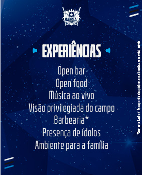 Compras “sócio-torcedor”: é obrigatória a apresentação de um comprovante de associação na entrada do camarote. A falta de apresentação implicará na obrigatoriedade de compra do complemento para o acesso ao Imortal Sports Bar.